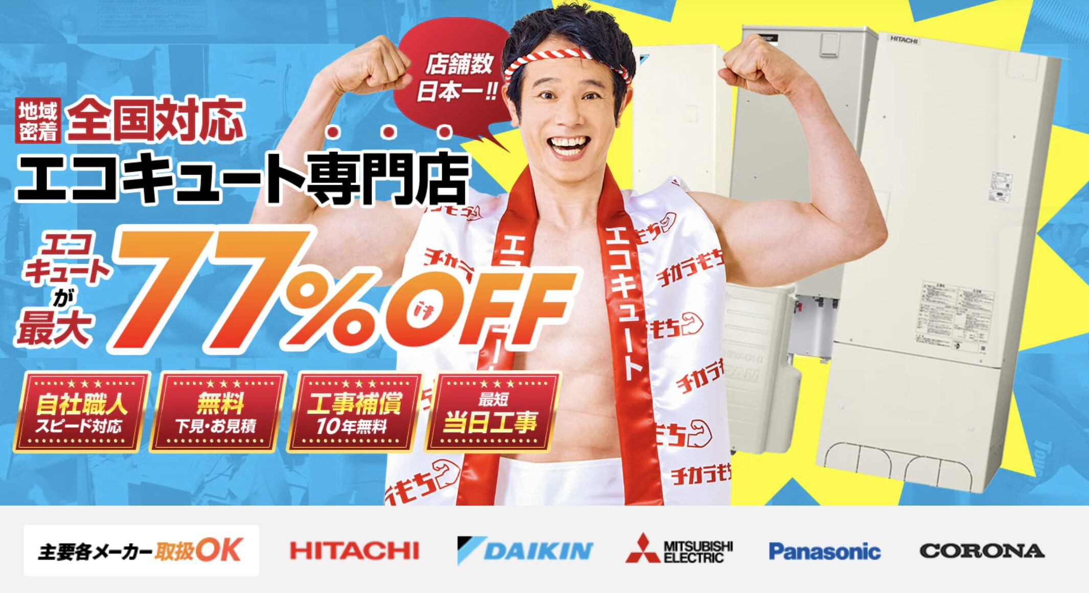 エコキュート本体は最大80%OFFで提供され、工事には無料の10年保証が付帯します。